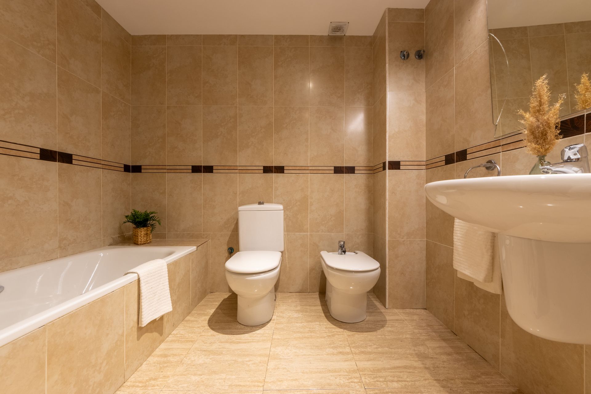 - It comprises 1 double bedroom, 2 single bedrooms, 1 full bathroom with a bathtub and 1 bathroom with a shower.