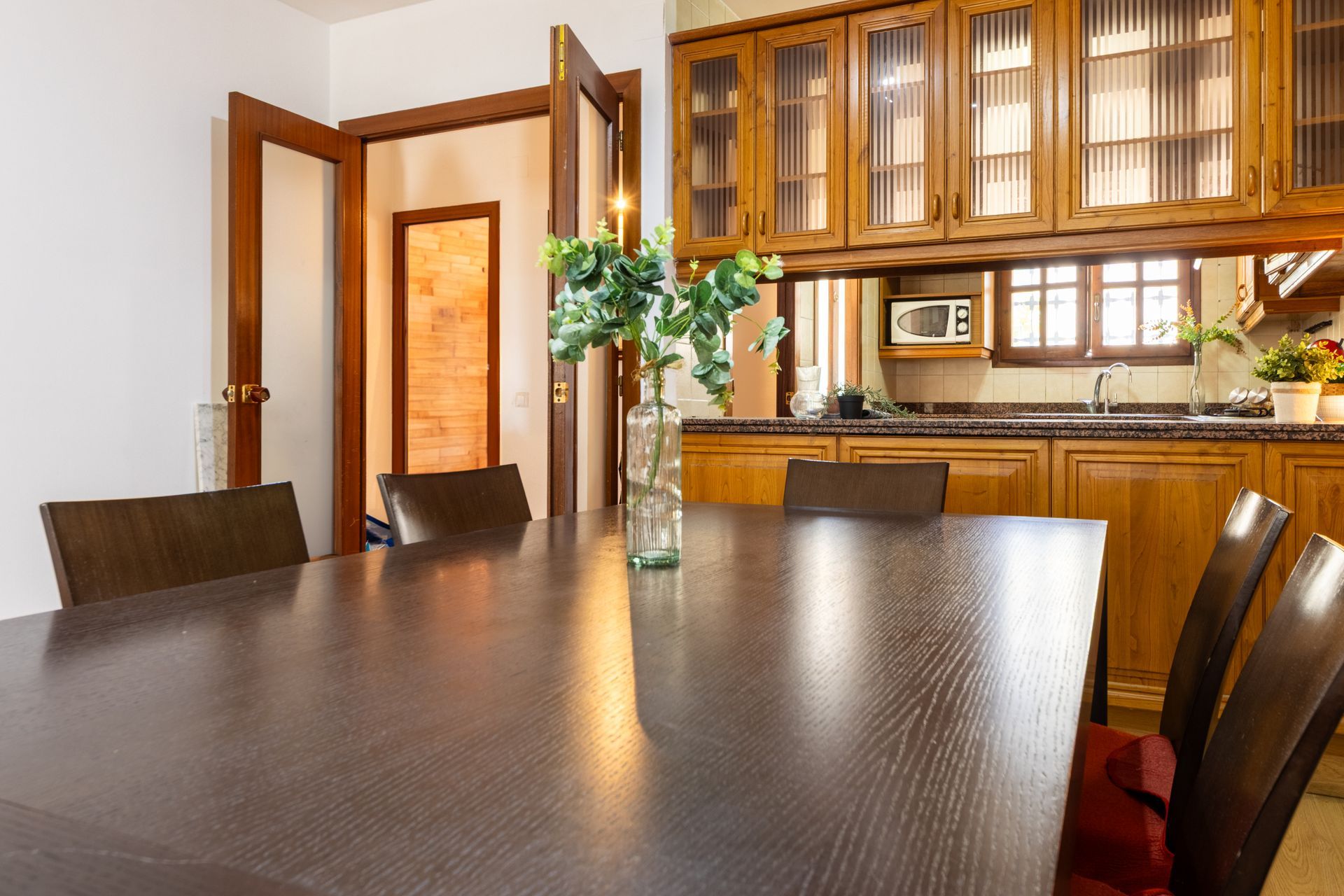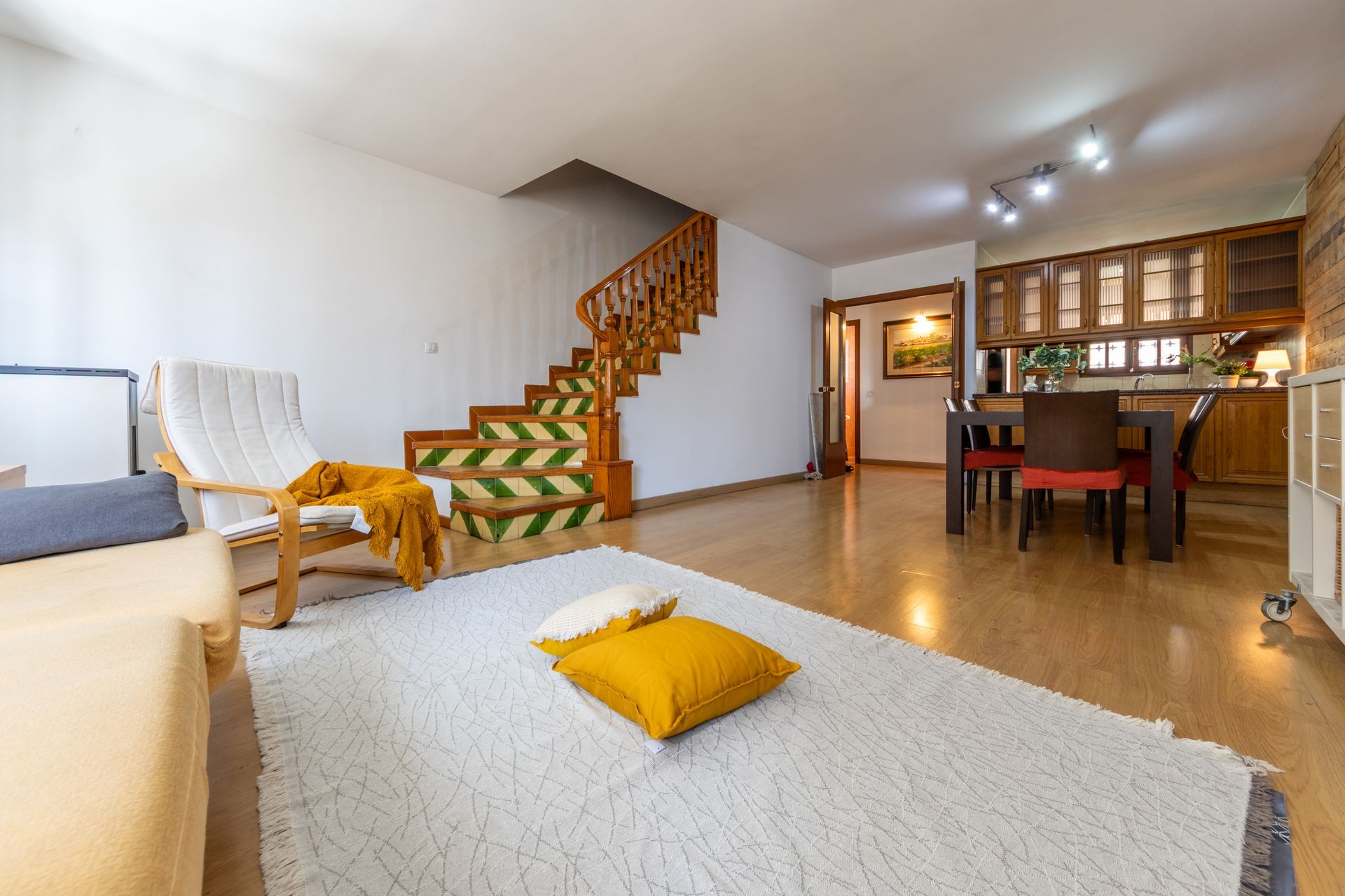 - La primera planta disposa d’un menjador amb finestral, cuina oberta al menjador amb mobiliari de fusta, safareig i lavabo.