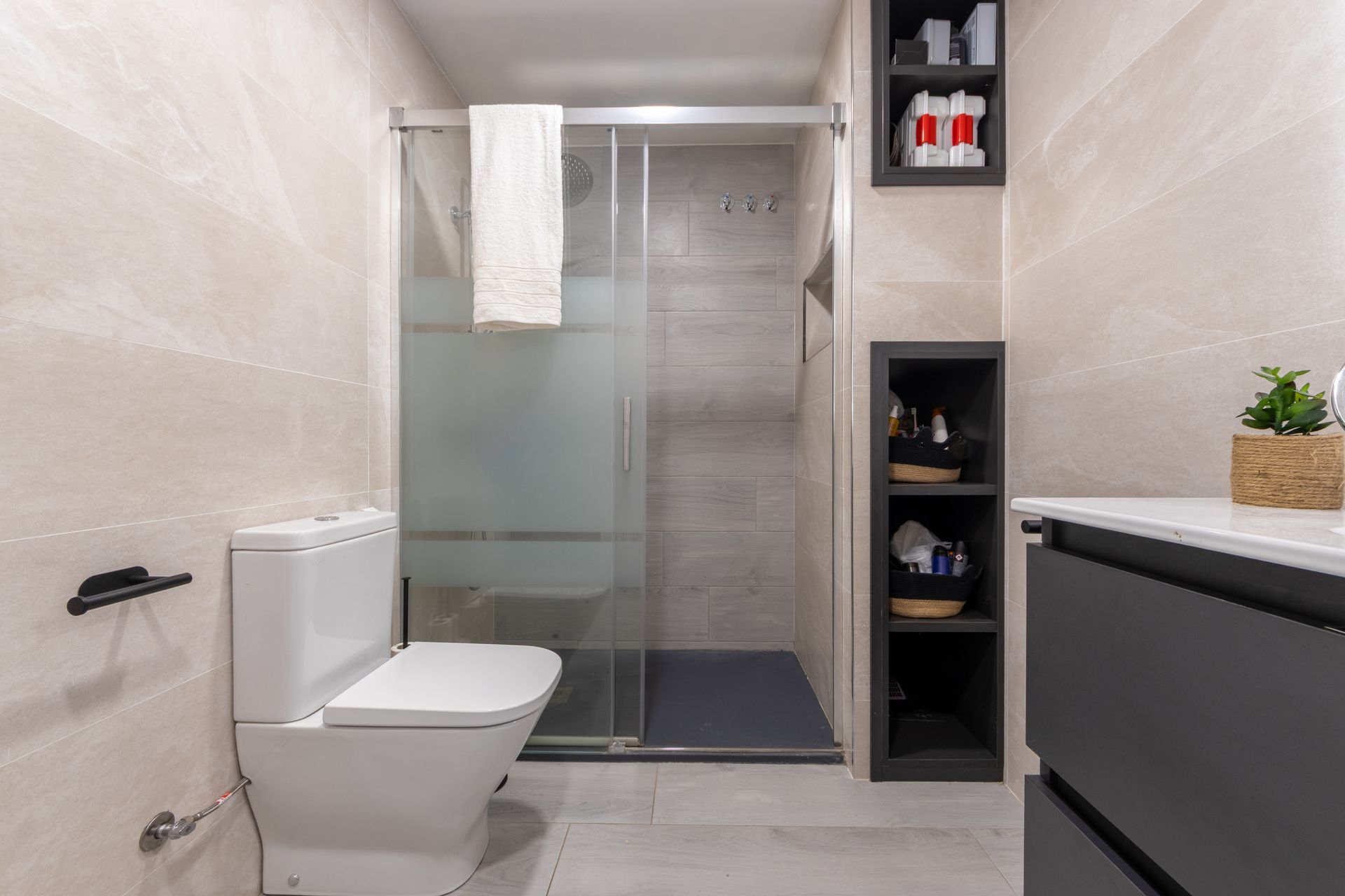 - Els acabats inclouen terra de parquet gris a totes les estances, excepte banys i cuina que són ceràmics símil parquet, també gris, fusteria exterior d'alumini climalit amb porta de fusta de seguretat i fusteria interior de fusta grisa nova. Disposa d'armaris encastats a l'habitació principal.